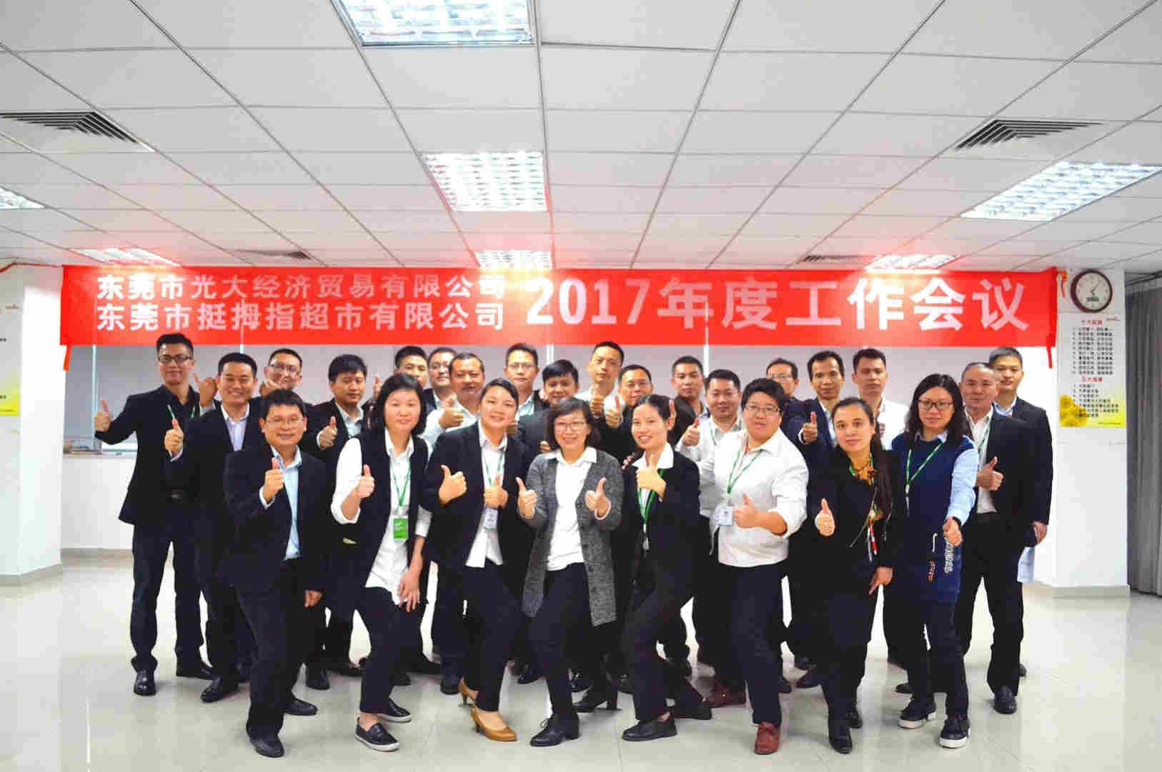 東莞市光大經(jīng)濟(jì)貿(mào)易有限公司(挺拇指生活超市)2017年度工作會(huì)議于2016年12月19日在光大總部召開(kāi),公司常務(wù)副總蓋莉君女士、各職能部門(mén)負(fù)責(zé)人及各門(mén)店店長(zhǎng)出席了會(huì)議。